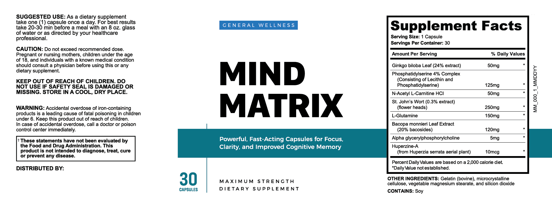 Mind Matrix is an advanced cognitive support formula featuring nootropic ingredients like Bacopa monnieri, Ginkgo biloba, and phosphatidylserine. Supports focus, memory, mental clarity, and overall brain health.
